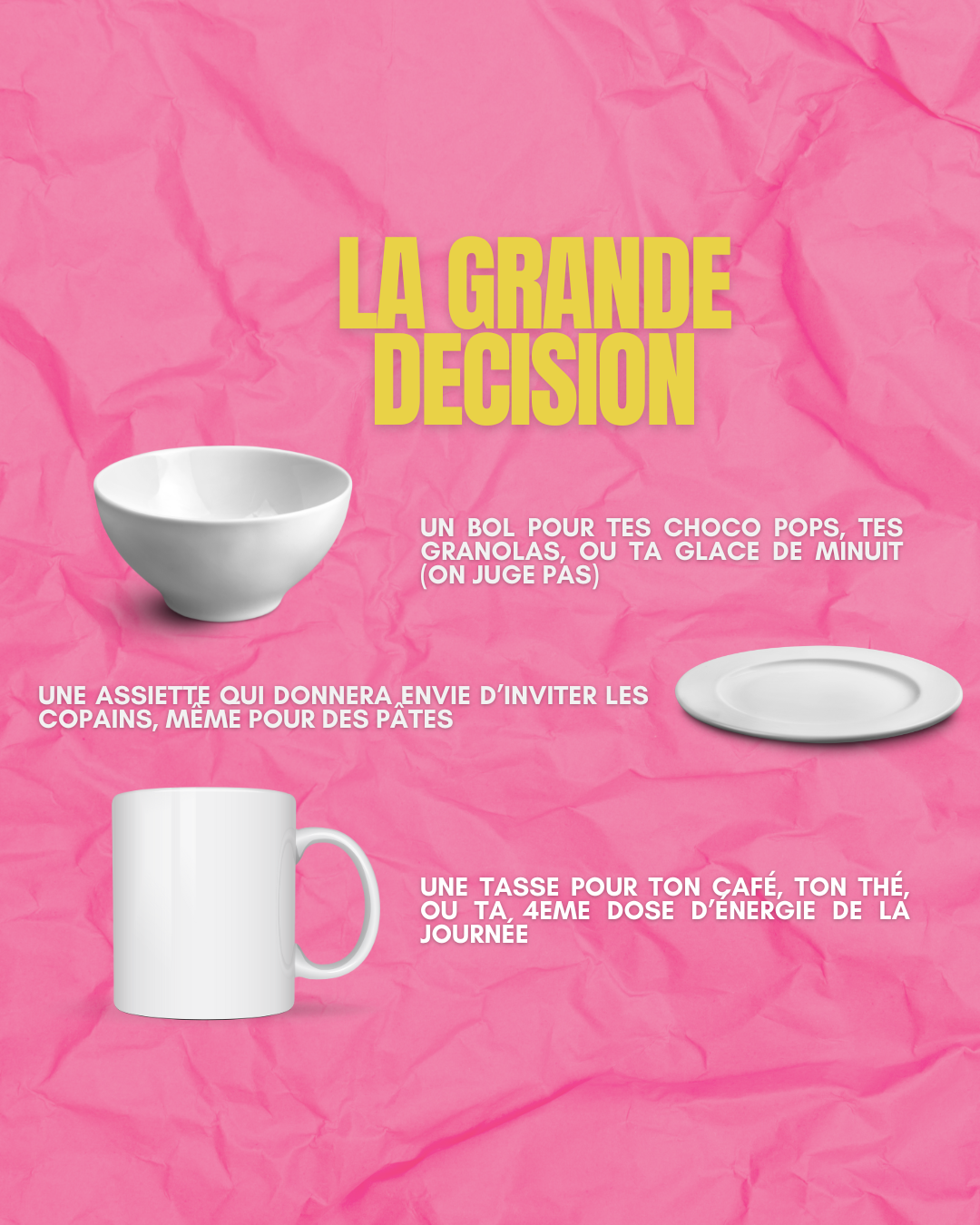 Ta première mission (et pas des moindres) : choisir ta pièce. Entre la tasse parfaite pour ton café du matin et le petit pot trop trop trop vraiment trop mignon, tu vas probablement mettre plus de temps que pour choisir ton plat au resto.